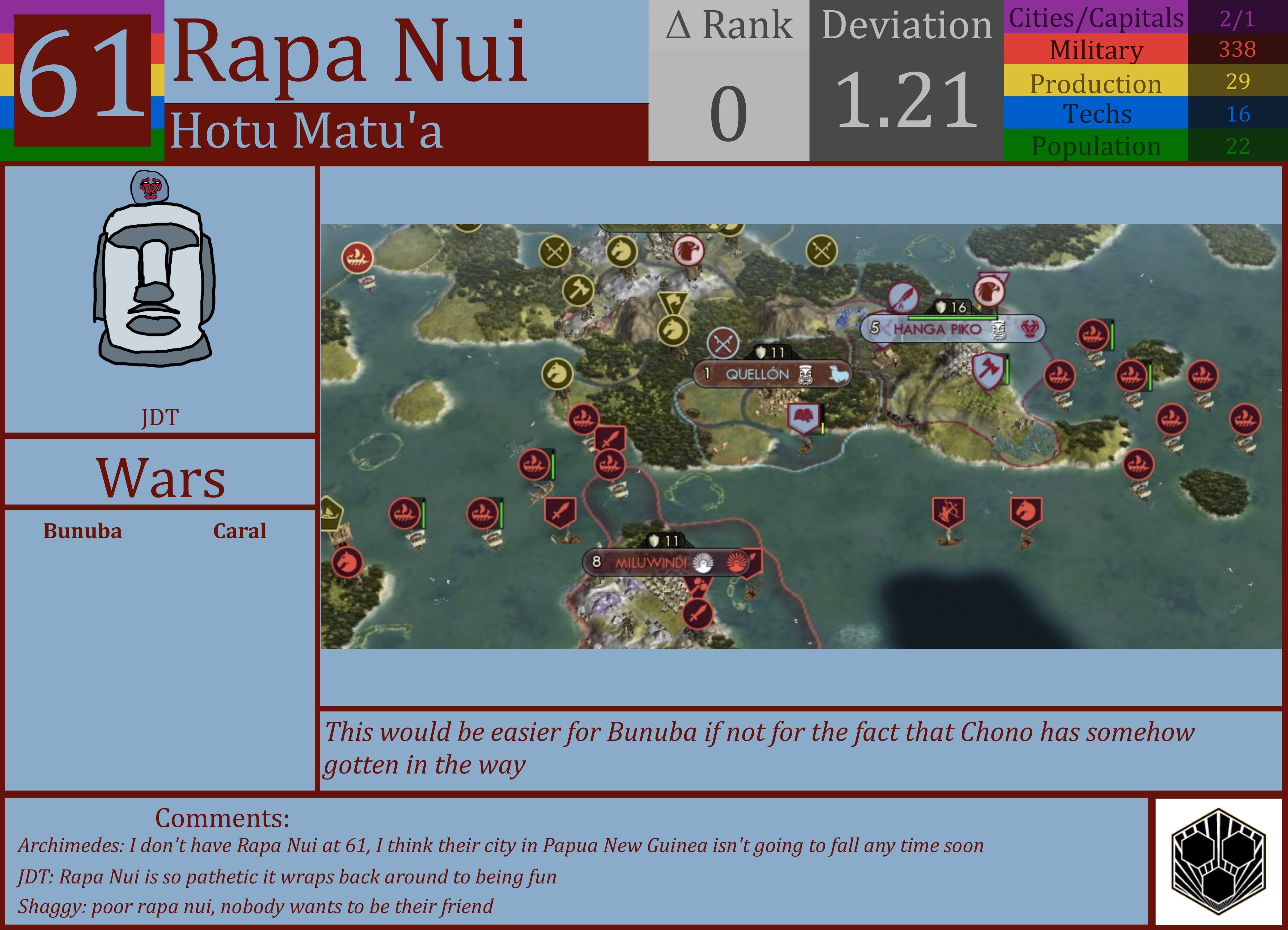 Multiple civs deal with coalition wars. Some wars and peace deals are just downright confusing. Armed conflicts rage across the cylinder. But events, both violent and peaceful, also happen in the coldest parts of the World. All the while, new wonders are being constructed by several civs. This is the episode of the 5 “C”s.